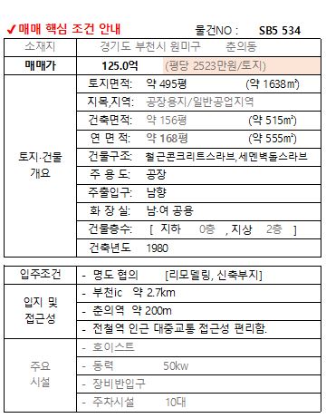 수도권 7호선 전철역 앞 뛰어난 입지의 공장용지 부천공장매매 물건을